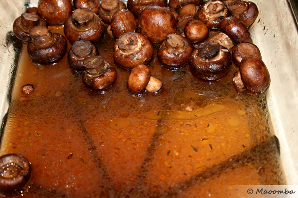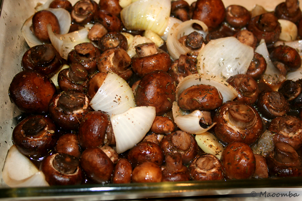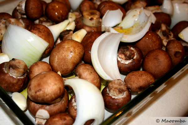 In a large glass baking dish, add cleaned, whole mushrooms, onion chunks (break them apart), and garlic. Drizzle with olive oil and toss to coat vegetables well. Cover dish with aluminum foil. Place in oven and cook for 20 minutes. Remove baking dish from oven and reserve ⅓ of the whole mushrooms.