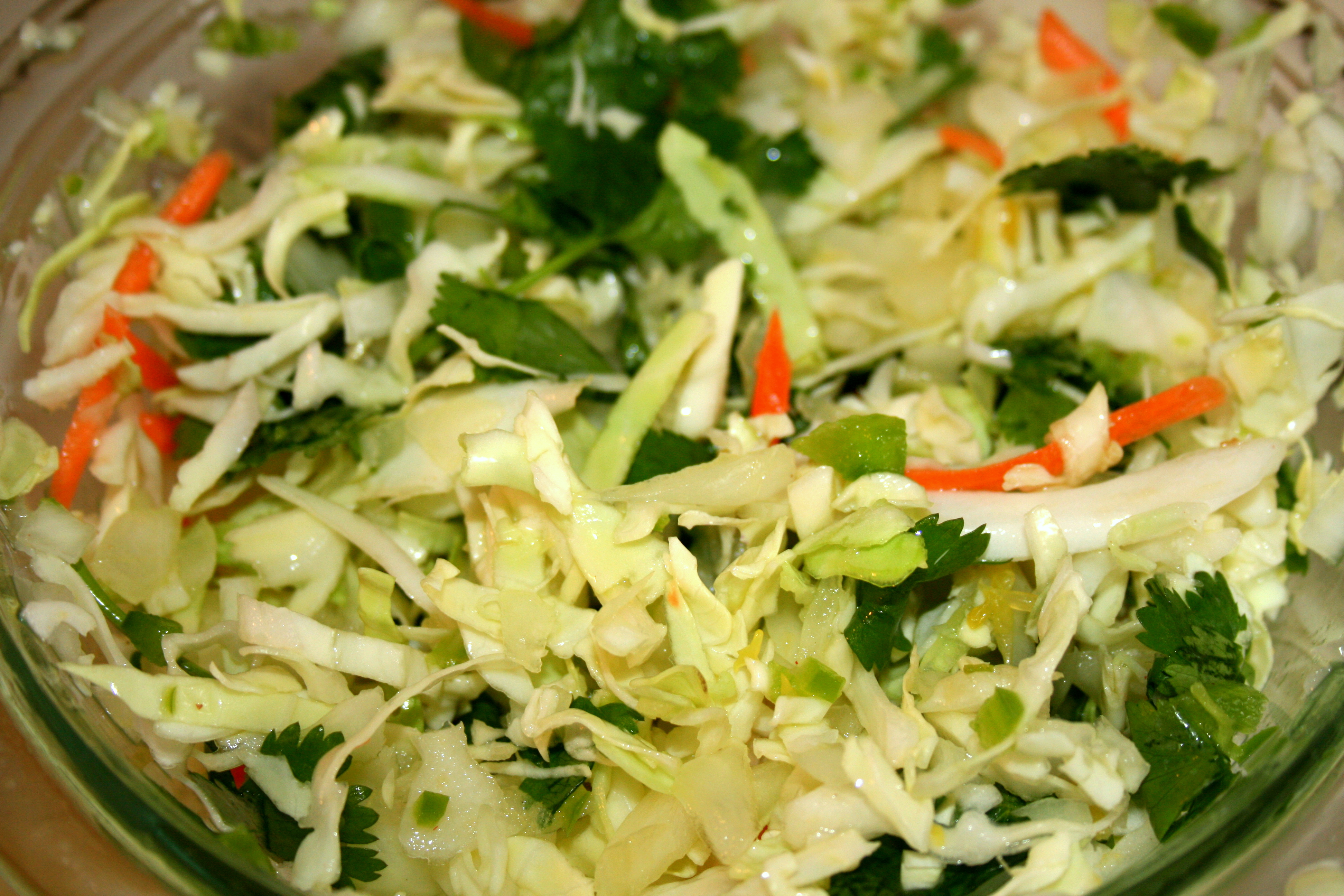 - 2 handfuls of shredded cabbage or cole slaw salad blend