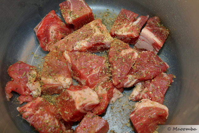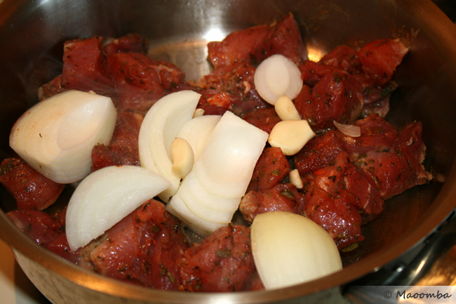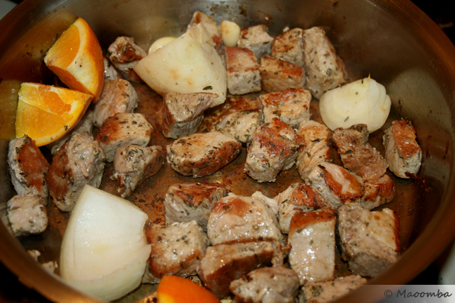 Add a couple of tablespoons of olive oil, bacon fat, or lard to the pan. When melted, place about 1/3 to 1/2 of the meat cubes in the pan to fry it up. It might take a couple of batches to cook all of the meat. When the meat is seared on all sides, add the onions and garlic. Cook for a minute or two and then add the oranges.