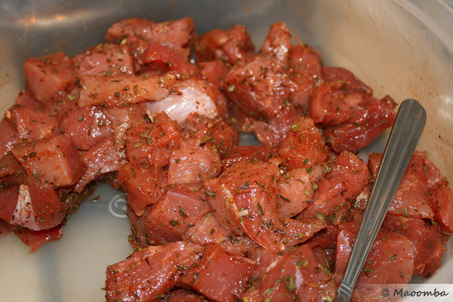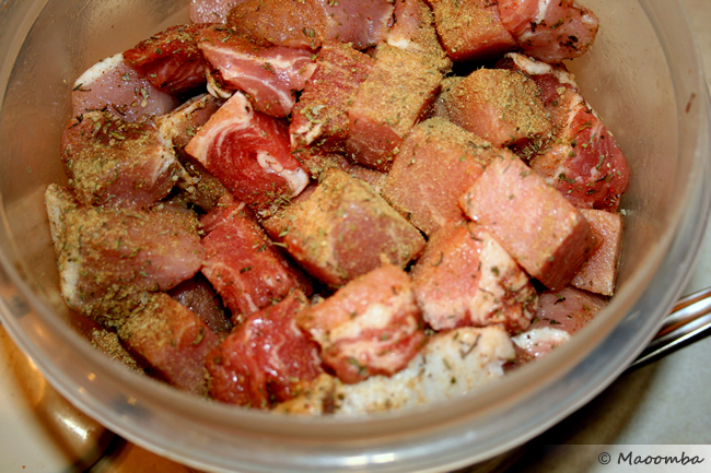 Take the pork shoulder or pork butt and cut it into 1 1/2″ cubes. Place the cubes in layers in a large food storage container, sprinkling a bit of the following dry rub recipe in between each layer. Place a lid on the container, shake it up a bit, and let the meat sit in the refrigerator overnight or for several hours.