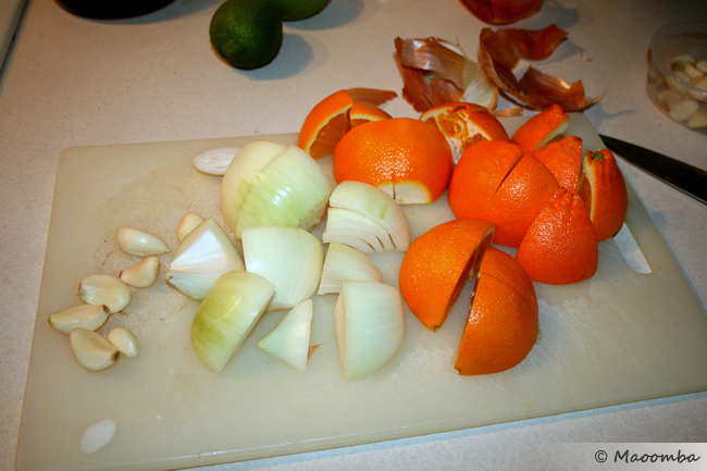 Once your meat has marinated for several hours, preheat a large casserole dish or large pan to medium-high heat. While you’re waiting for it to heat, cut 2 oranges and 1 large onion into eighths, and peel 6 cloves of garlic.
