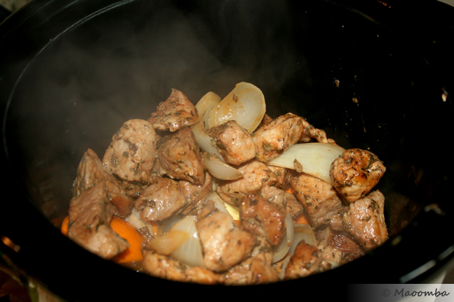 When it’s done, your pork should be tender, staying in cubes that can be cut easily with the side of a fork, but not disintegrate.