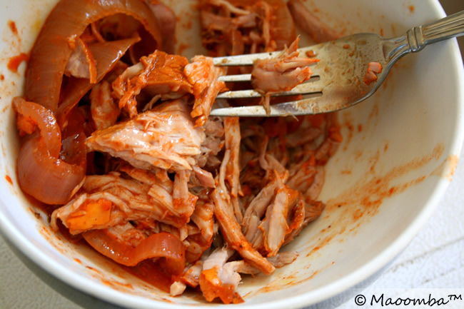 Unwrap banana leaves and scrape the red onions and bay leaves off the top – reserve for later use (maybe cook down more to soften onions if needed). Remove meat from crock-pot and let stand covered lightly with foil for 30 minutes. Then shred the meat and remove the bone.