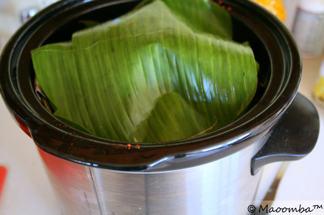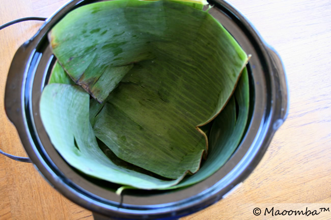Thaw the banana leaves if frozen, rinse and pat dry. Cover the bottom and sides of the crock-pot with the banana leaves, overlapping the leaves and letting them spill over the sides of the pot.